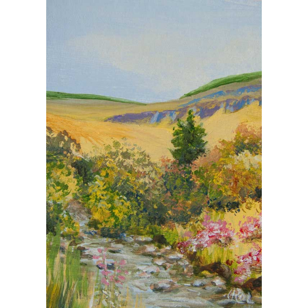An original, one off miniature ACEO, Artist Trading Card format landscape painting from Blaen Rhondda, in the South Wales valleys UK. This is an acrylic miniature painting on primed mountboard. On the reverse is a certificate of authenticity. This tiny painting is 2.5 x 3.5 inches.