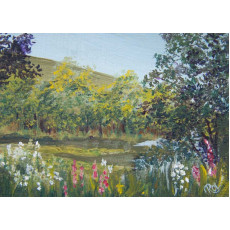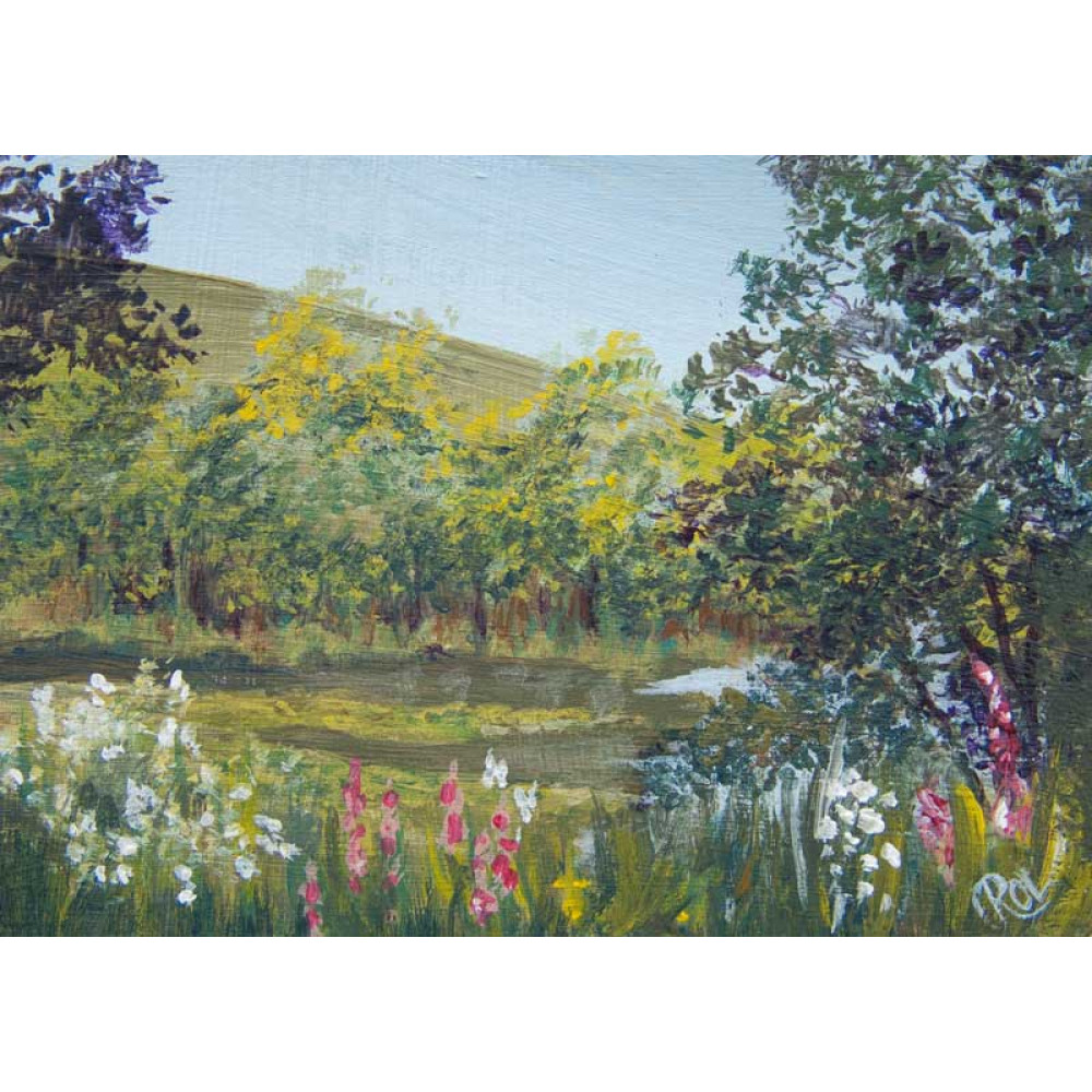 An original miniature landscape painting of the lake at Parc Cwm Darren, Bargoed, South Wales, UK also known as Derry Park. The painting is in acrylic on primed mountboard in the ACEO, Artist Trading Card format of 2.5 x 3.5 inches. A signed certificate of authenticity is on the reverse.