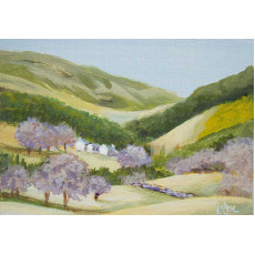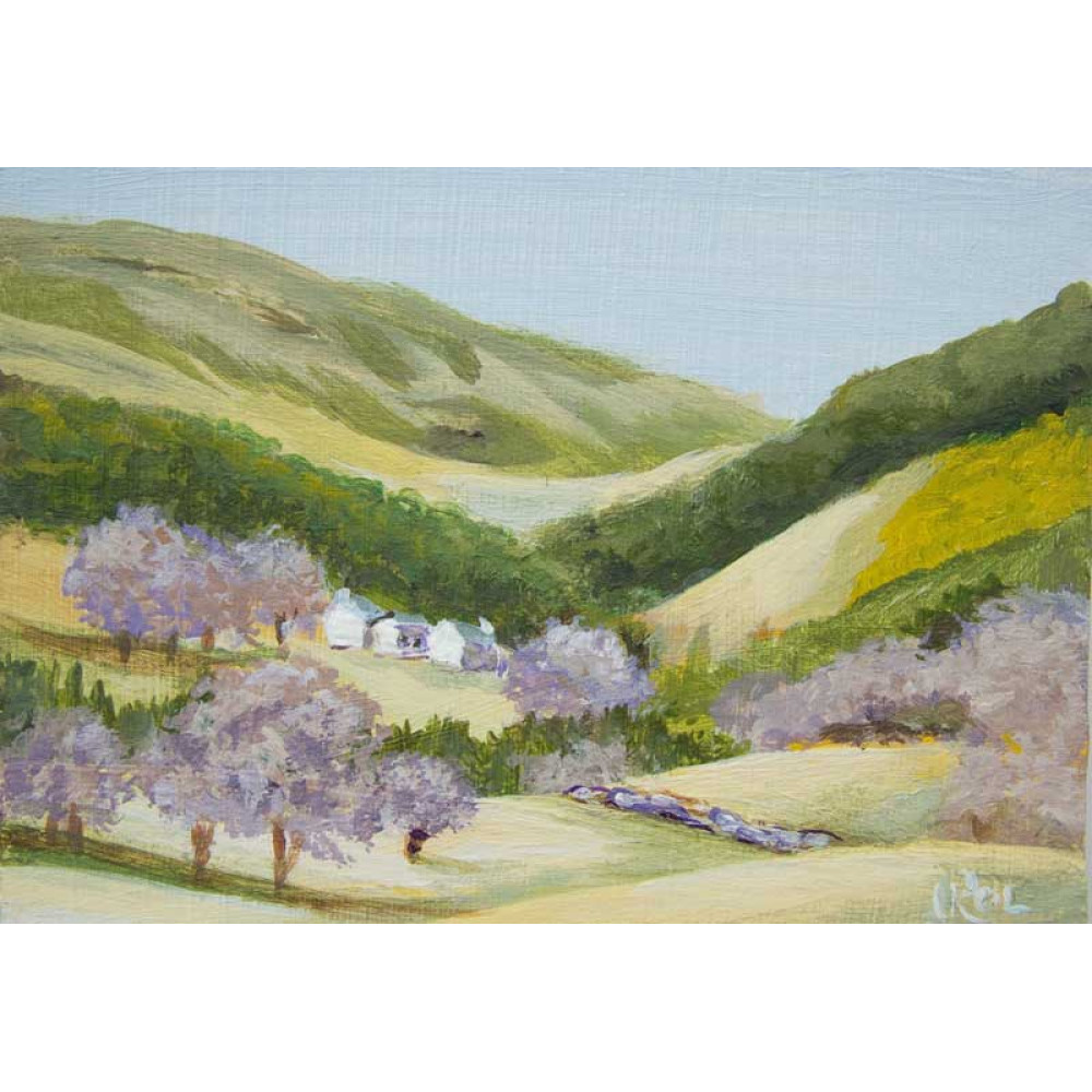 A miniature landscape painting of a scene from Cwmcarn Forest Drive, "Windy Ridge" in the South Wales Valleys. The miniature is in the ACEO, Artist Trading Card format of 2.5 x 3.5 inches. It is an acrylic painting on primed mountboard with a certificate of authenticity on the reverse.