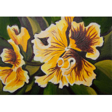An original miniature floral painting of yellow Violas in ACEO or Artist Trading Card format of size just 2.5 x 3.5 inches (6.4x8.9cm). This tiny art work is painted in acrylic on primed mountboard. It has a signed Certificate of Authenticity on the reverse. This is an original one of painting.