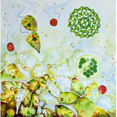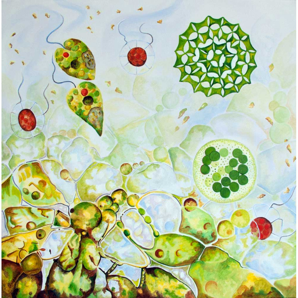 "Algae Life" is a contemporary painting of just a few of the many different forms of single cell algae discovered under the microscope from studies of water samples from our birdbath and wildlife pond at home. There is so much life that we can't normally see.