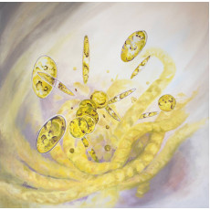 A contemporary, cosmic style painting of algae forms developed from microscope studies that appears abstract but is in fact reality. The algae here are a form of filamentous algae in long strings and others that cluster in groups or remain as single cells.