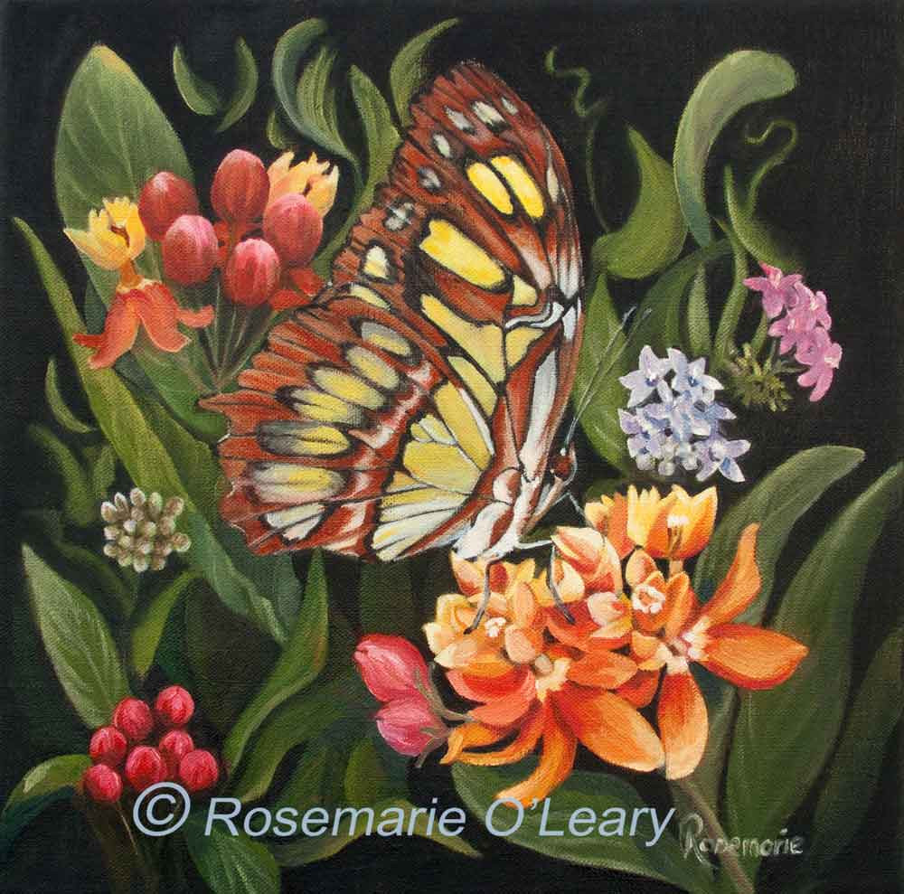 An inspiration from a visit to an exotic butterfly house and working from my own reference photographs. The Malachite butterfly, native to South America is one of the largest of the butterflies of the world.