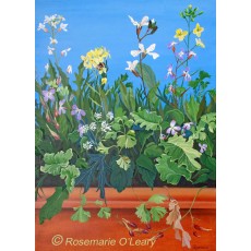Inspired from our garden and growing our own vegetables. The mixed salad plants that escaped picking produced beautiful delicate small flowers. The flowers combined with the different shaped leaves, gave me the idea for this bold, contemporary style painting, complete with growing tub and a blue sky background.