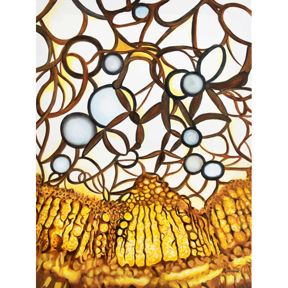 Inspired from studying the inside of plants, "Rose Stem Cells" shows the cells that make up a very thin slice of the stem of a rose from the woody gold outer layers moving through to the clear centre.