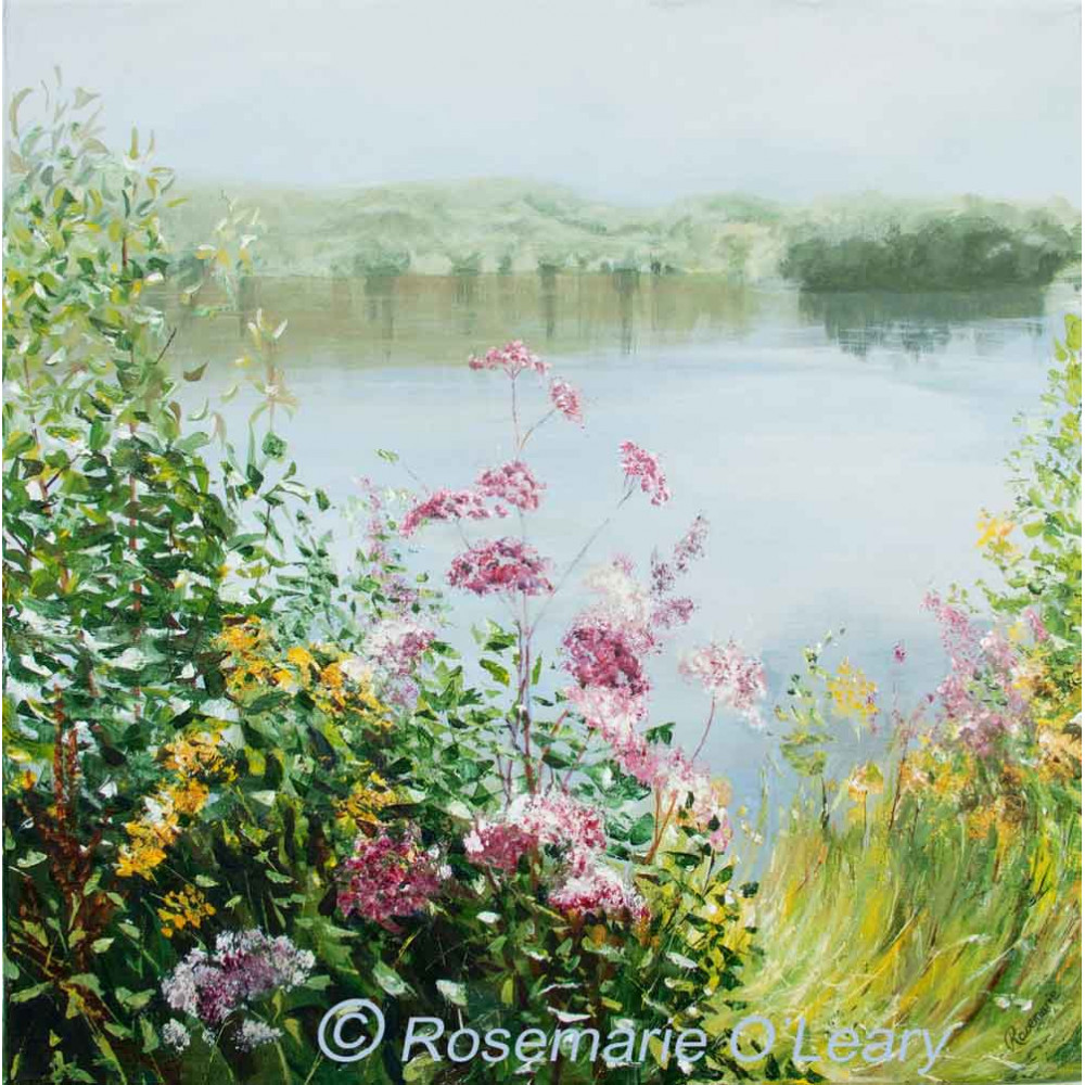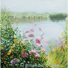 A contemporary expressive style painting of summer wild flowers at the edge of Brynbach Park Lake. Painted with a mix of pallette knife and brush.