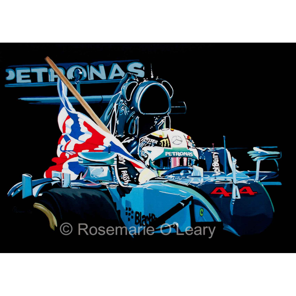 A contemporary and bold acrylic painting, the "Big Win" was inspired following Lewis Hamilton's Championship win with the Mercedes Team, and his lap of honour with the flag flying. It was painted in keeping with the contemporary art style I was developing for this group of paintings.